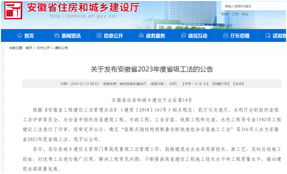 近日,由從安徽省住房和城鄉建設廳傳來喜訊,由公司申報的兩項工法通過專家評審,獲2023年安徽省省級工程建設工法,為企業科技創新再添新業績。